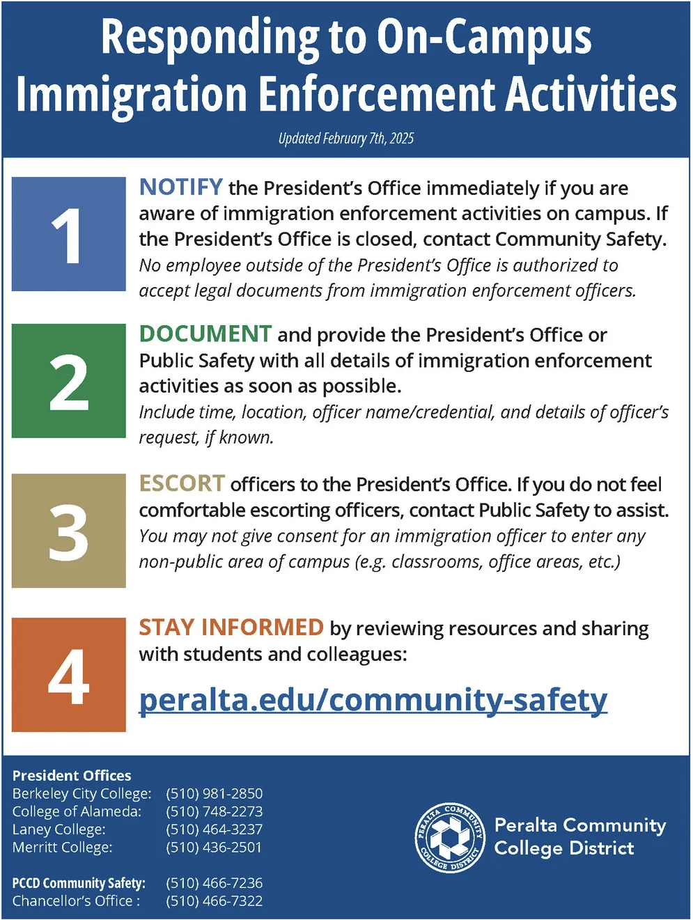 Administrative Procedure (AP) 3415, Peralta’s protocol for immigration enforcement activities, advises students and staff to document any appearance of immigration enforcement agents on campus and report sightings directly to the college president.
