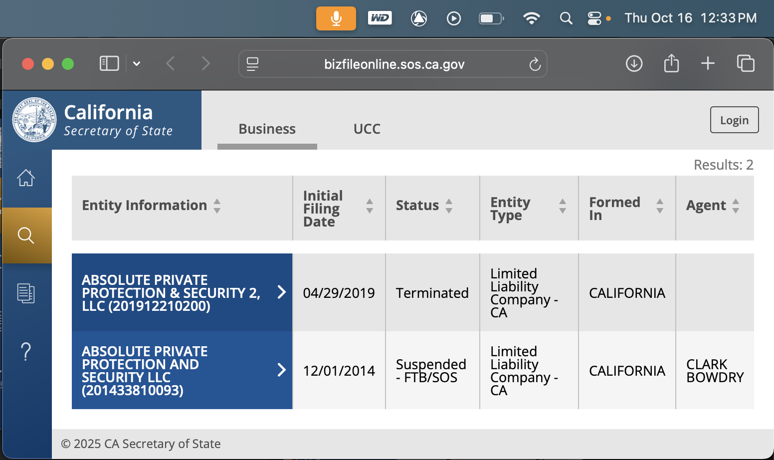 A second company called “Absolute Private Protection & Security 2” also appears in the Secretary of State’s database with a terminated business license, though it is associated with a “resigned or invalid agent.” The second company initially filed for its LLC in March 2019, but it has been inactive since March 2021.