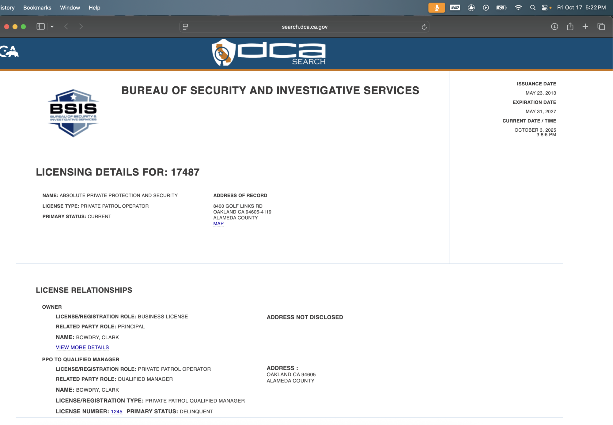 According to the BSIS online database, Bowdry’s qualified manager license has been delinquent since July 31. Bowdry has received two citations from the BSIS for operating without valid licensing – one on April 11, 2022 and one on Sep. 10, 2025.